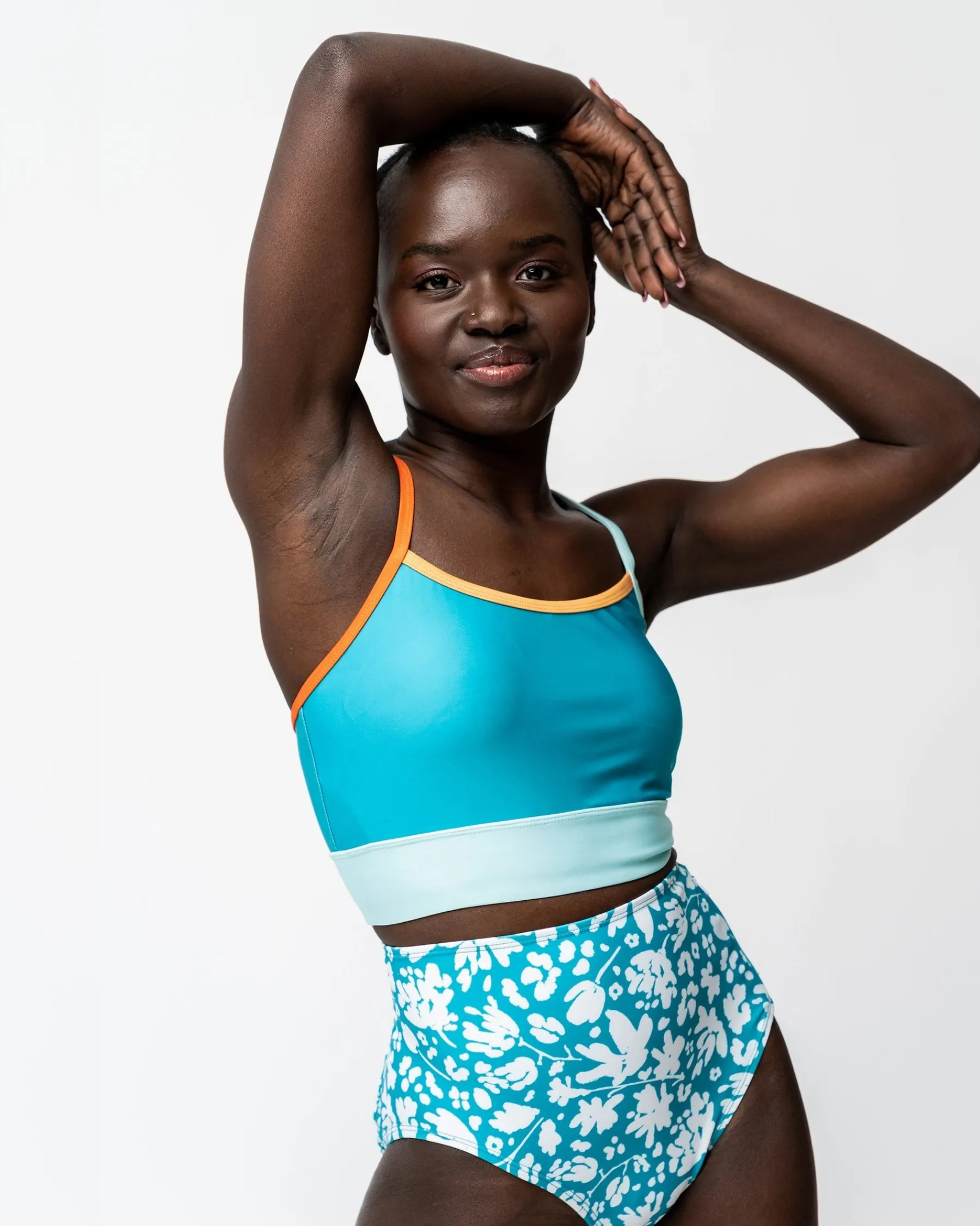 This bottom is a great option for a classic, simple style with a twist featuring a hidden zipper pocket on the solid-colored side panel because every girl needs a swimsuit with a pocket. Bright turquoise and white floral print.